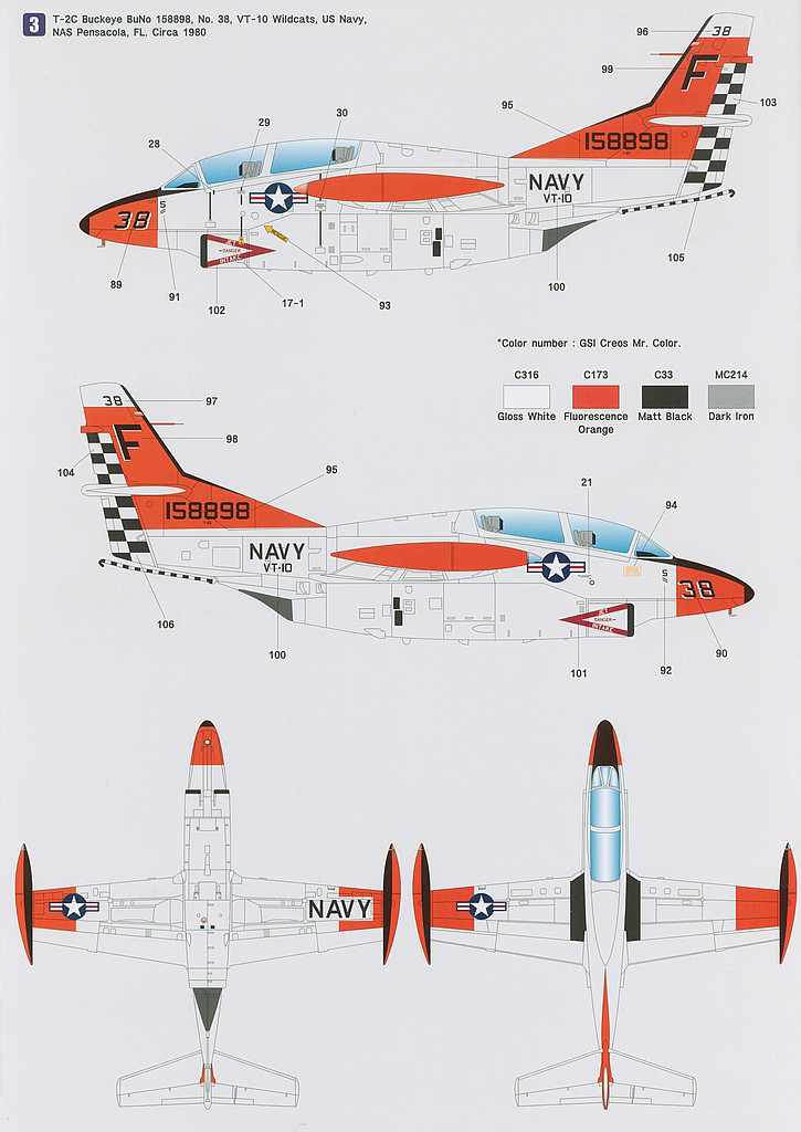 T-2C: Endgültige Produktionsversion für die US Navy mit zwei General Electric J85-GE-4-Triebwerk mit 13,1 kN Schub. 231 Stück gebaut. Quelle: Wikipedia