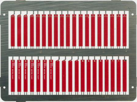 Fotoätzteilplatinen -eine davon farbig bedruckt- für Interieur und Exterieur, eine beidseitig farbig bedruckte Ätzteilplatine “Remove Before Flight”-Fähnchen