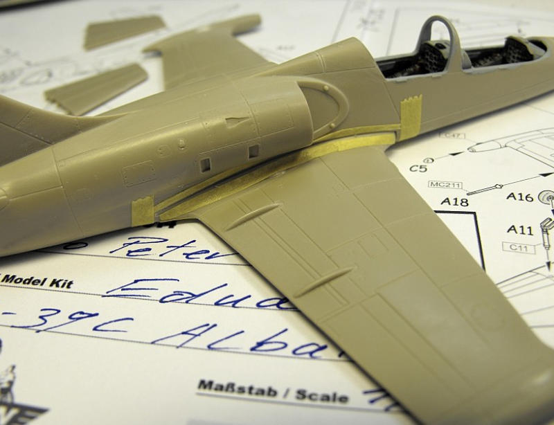 Hiermit möchte ich meinen ersten Wettbewerbsbeitrag einreichen.Ich hatte mich für die Albatros entschieden, da dieses Baumuster für mich der Innbegriff eines Düsenflugzeug-Trainers ist.Der Bausatz kommt von Eduard und hat in dieser Weekend-Schachtel nur diese eine Markierungsmöglichkeit. Aber gerade diese ist eben höchst reizvoll.Das originale Flugzeug wurde von dem tschechischen Flugzeugkonzern “Aero Vodochody” gebaut. Diese L-39C Albatross wurde im Jahr 2003 mit einer zivilen Kennung N439RS auf der Edwards Luftwaffenbasis in Kalifornien eingesetzt.Da diese abgespeckte Weekend-Version nur ein einfaches Cockpit mit Abziehbildern hat, wollte ich zuerst einen CMK interior Satz verwenden. Allerdings war die Passgenauigkeit sowohl des Bausatzes als auch der Zubehörteile sehr schlecht. So plünderte ich einen weiteren Bausatz von Eduard und verwendete nun die Farb-Metallteile in Kombination zu dem Rest.Der Eduard Bausatz zeigt schon deutliche Spuren einer ausgenudelten Form. Sinkstellen sind überall vorhanden und müssen gefüllt werden.Eigentlich sollte die Verglasung offen sein. Dies ging aber nicht, da weder die gespritzte, noch die Haube aus dem CMK Zubehör passten. Die CMK-Haube ist beidseitig 2mm zu kurz!Nach vielen Versuchen und grauen Haaren ging es, aber geschlossen.Die Bemalung mit der Spritzpistole ging dagegen unspektakulär. Ebenso die sehr guten und dünnen Abziehbilder von Eduard.Als Untergrund zum präsentieren dient mir ein Kartonbogen von Uschi van der Rosten. Dieser stellt die March Air Reserve Base in Kalifornien dar.Ich wünsche viel Vergnügen mit den Fotos,Jo Peter